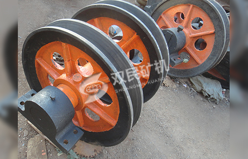 1、雙槽懸吊天輪和單槽懸吊天輪的結構主要有繩輪、固定軸、及軸承座組成。繩輪內孔鑲嵌有合金銅套,工作時繞軸作旋轉運動,輪轂上裝有油杯,供軸與銅套之間潤滑用。雙槽天輪有兩個繩輪,其間裝有調整圈,可以對兩輪之間的距離進行調整。